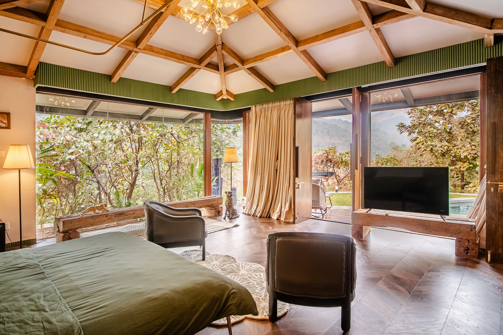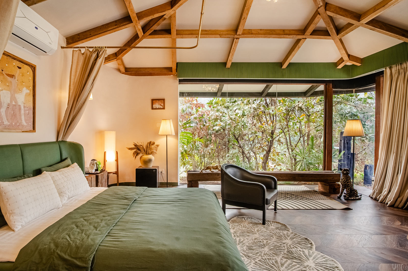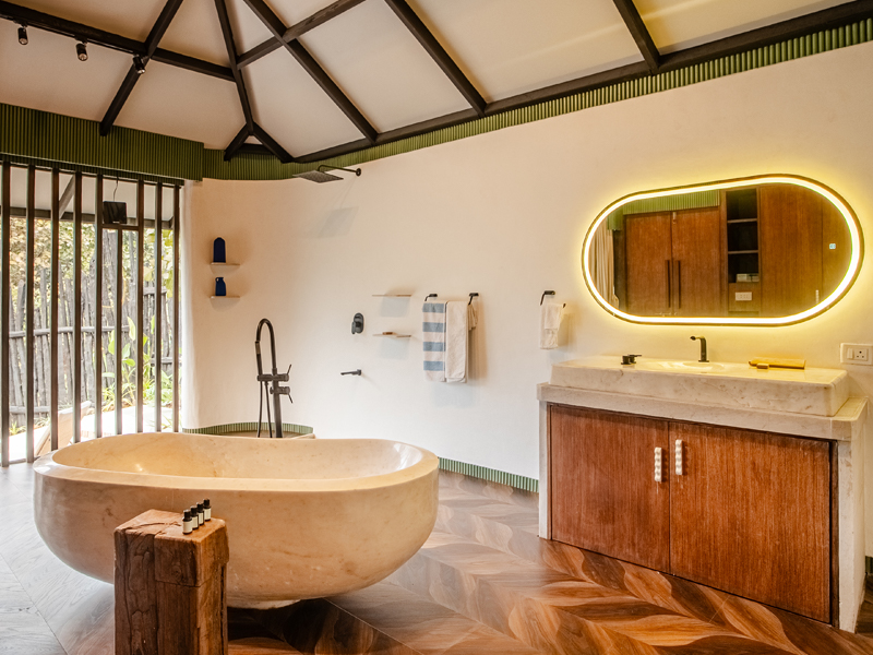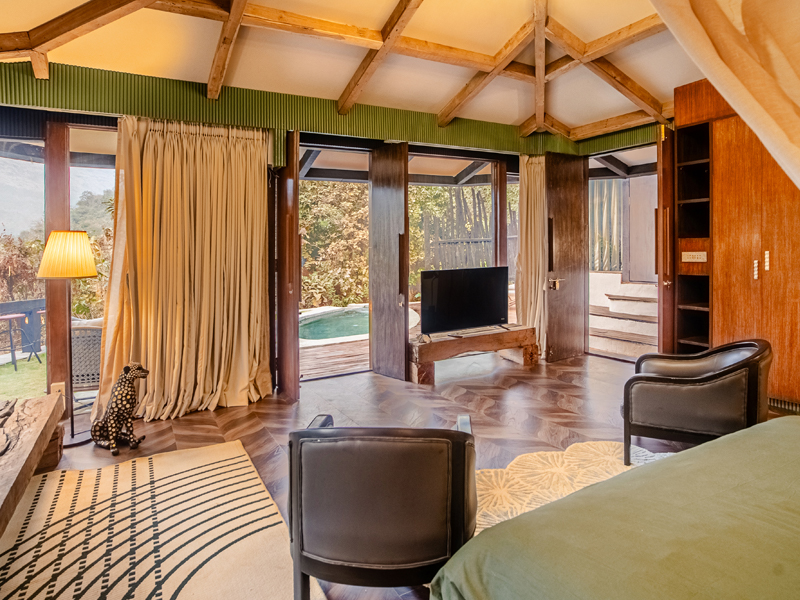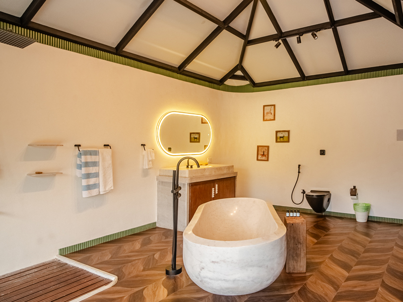 The lake cabin offers a serene and beautiful open view of both the lake and surrounding forest. Please note that the washroom is not attached to the bedroom but is located within the private compound for your exclusive use. The lake itself is occasionally accessed by local tribal villagers, particularly during the early mornings. While they are respectful and cause no disturbance, some couples may prefer a bit more privacy, while others don't mind. Since the lake is part of forest property, we do not have the authority to restrict access.